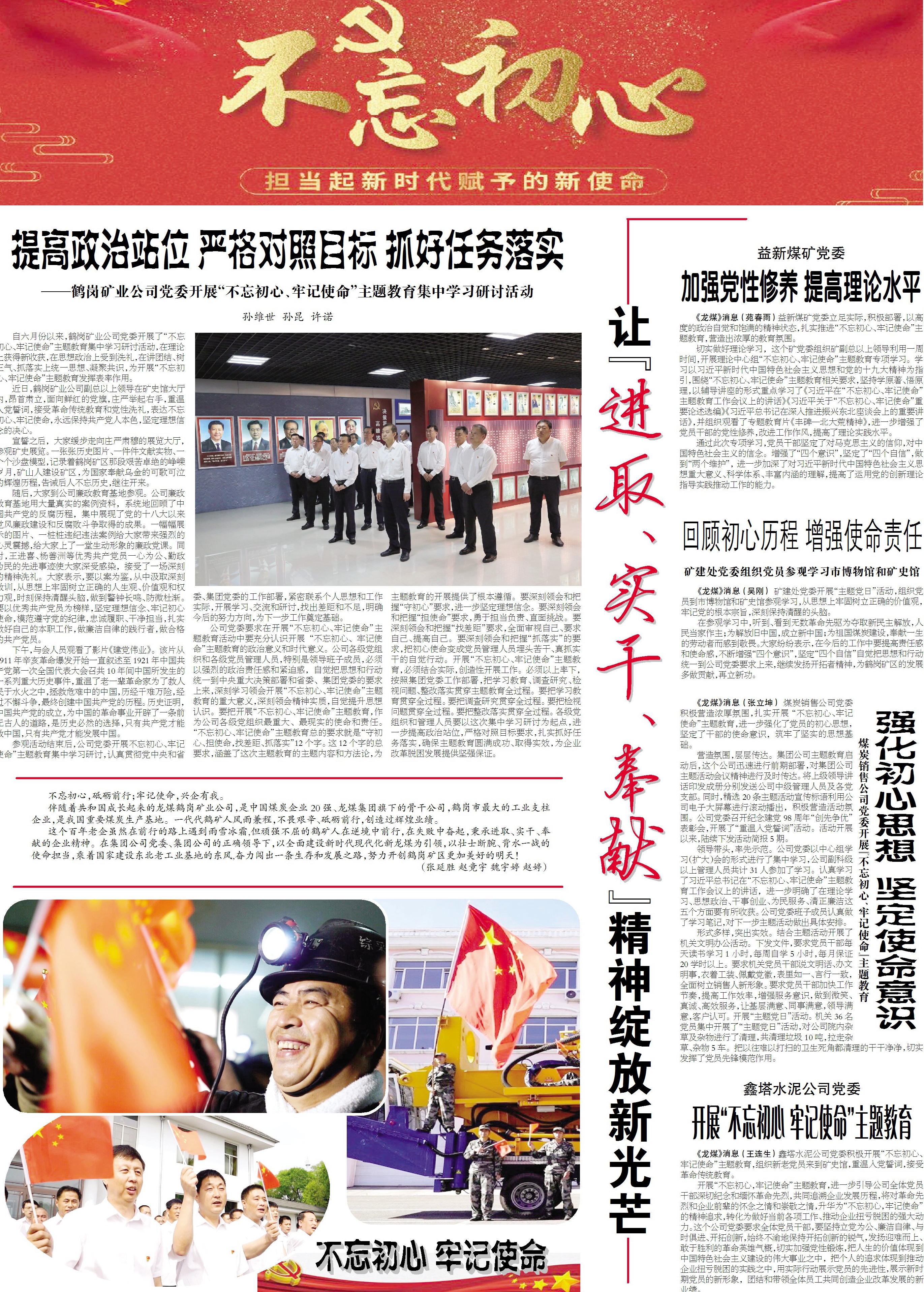 公司黨委要求在開展“不忘初心、牢記使命”主題教育活動中要充分認識開展“不忘初心、牢記使命”主題教育的政治意義和時代意義。公司各級黨組織和各級黨員管理人員,特別是領導班子成員,必須以強烈的政治責任感和緊迫感,自覺把思想和行動統(tǒng)一到中央重大決策部署和省委、集團黨委的要求上來,深刻學習領會開展“不忘初心、牢記使命”主題教育的重大意義,深刻領會精神實質,自覺提升思想認識。要把開展“不忘初心、牢記使命”主題教育,作為公司各級黨組織最重大、最現(xiàn)實的使命和責任。“不忘初心、牢記使命”主題教育總的要求就是“守初心、擔使命,找差距、抓落實”12個字。這12個字的總要求,涵蓋了這次主題教育的主題內容和方法論,為主題教育的開展提供了根本遵循。要深刻領會和把握“守初心”要求,進一步堅定理想信念。要深刻領會和把握“擔使命”要求,勇于擔當負責、直面挑戰(zhàn)。要深刻領會和把握“找差距”要求,全面審視自己、要求自己、提高自己。要深刻領會和把握“抓落實”的要求,把初心使命變成黨員管理人員埋頭苦干、真抓實干的自覺行動。開展“不忘初心、牢記使命”主題教育,必須結合實際,創(chuàng)造性開展工作。必須以上率下,按照集團黨委工作部署,把學習教育、調查研究、檢視問題、整改落實貫穿主題教育全過程。要把學習教育貫穿全過程。要把調查研究貫穿全過程。要把檢視問題貫穿全過程。要把整改落實貫穿全過程。各級黨組織和管理人員要以這次集中學習研討為起點,進一步提高政治站位,嚴格對照目標要求,扎實抓好任務落實,確保主題教育圓滿成功、取得實效,為企業(yè)改革脫困發(fā)展提供堅強保證。(孫維世 孫昆 許諾)