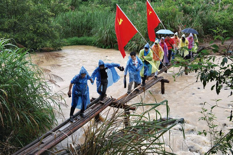 2019年6月11日至8月18日,中央宣傳部組織開展了“壯麗70年·奮斗新時(shí)代——記者再走長征路”主題采訪活動(dòng),先后有1300余名記者追隨當(dāng)年紅軍長征步伐,深入實(shí)地采訪,累計(jì)跨越16000余公里,推出10000余篇鮮活生動(dòng)、形式多樣的報(bào)道,網(wǎng)上總閱讀量近20億次。習(xí)近平總書記近日對(duì)“記者再走長征路”主題采訪活動(dòng)作出重要指示強(qiáng)調(diào),中央宣傳部組織開展的“記者再走長征路”主題采訪活動(dòng),生動(dòng)再現(xiàn)壯懷激烈、驚天動(dòng)地的革命故事,對(duì)闡釋用生命和鮮血鑄就的偉大長征精神很有意義。圖為6月13日,參加主題采訪活動(dòng)的記者們,在江西于都縣祁祿山沿著當(dāng)年中央紅軍長征走過的“紅軍小道”冒雨行進(jìn),體驗(yàn)紅軍穿越深山峽谷的艱苦行程。 經(jīng)濟(jì)日報(bào)記者 劉興/攝