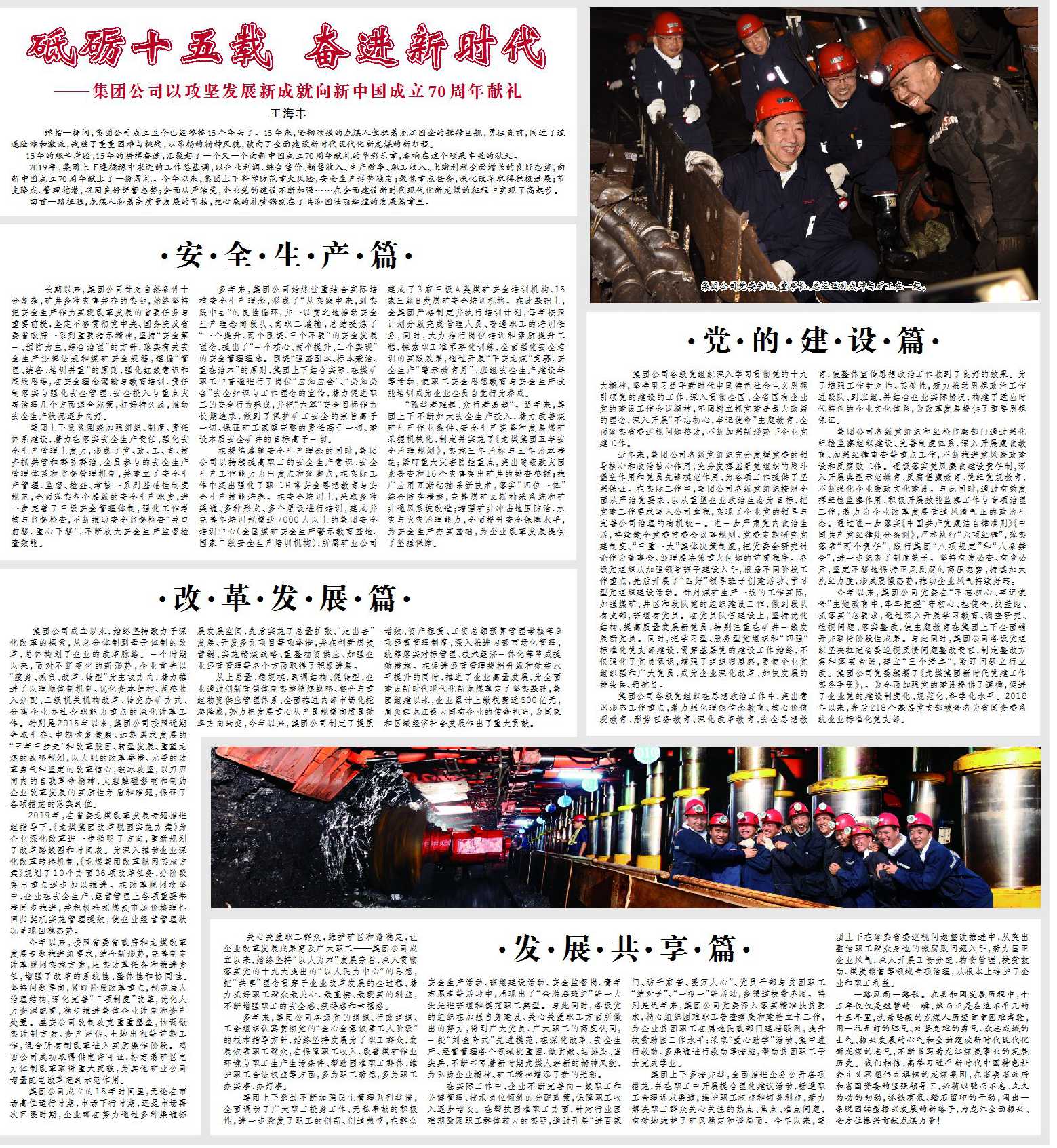 2019年,集團上下遵循穩(wěn)中求進的工作總基調(diào),以企業(yè)利潤、綜合售價、銷售收入、生產(chǎn)效率、職工收入、上繳利稅全面增長的良好態(tài)勢,向新中國成立70周年獻上了一份厚禮。今年以來,集團上下科學防范重大風險,安全生產(chǎn)形勢穩(wěn)定;聚焦重點任務,深化改革取得積極進展;節(jié)支降成、管理挖潛,鞏固良好經(jīng)營態(tài)勢;全面從嚴治黨,企業(yè)黨的建設不斷加強……在全面建設新時代現(xiàn)代化新龍煤的征程中實現(xiàn)了高起步。