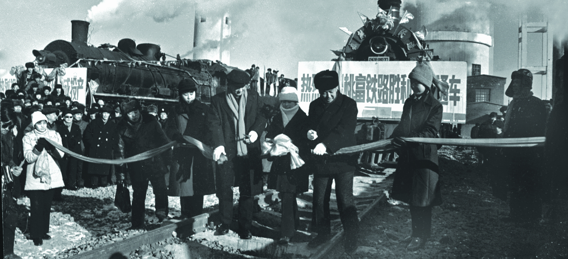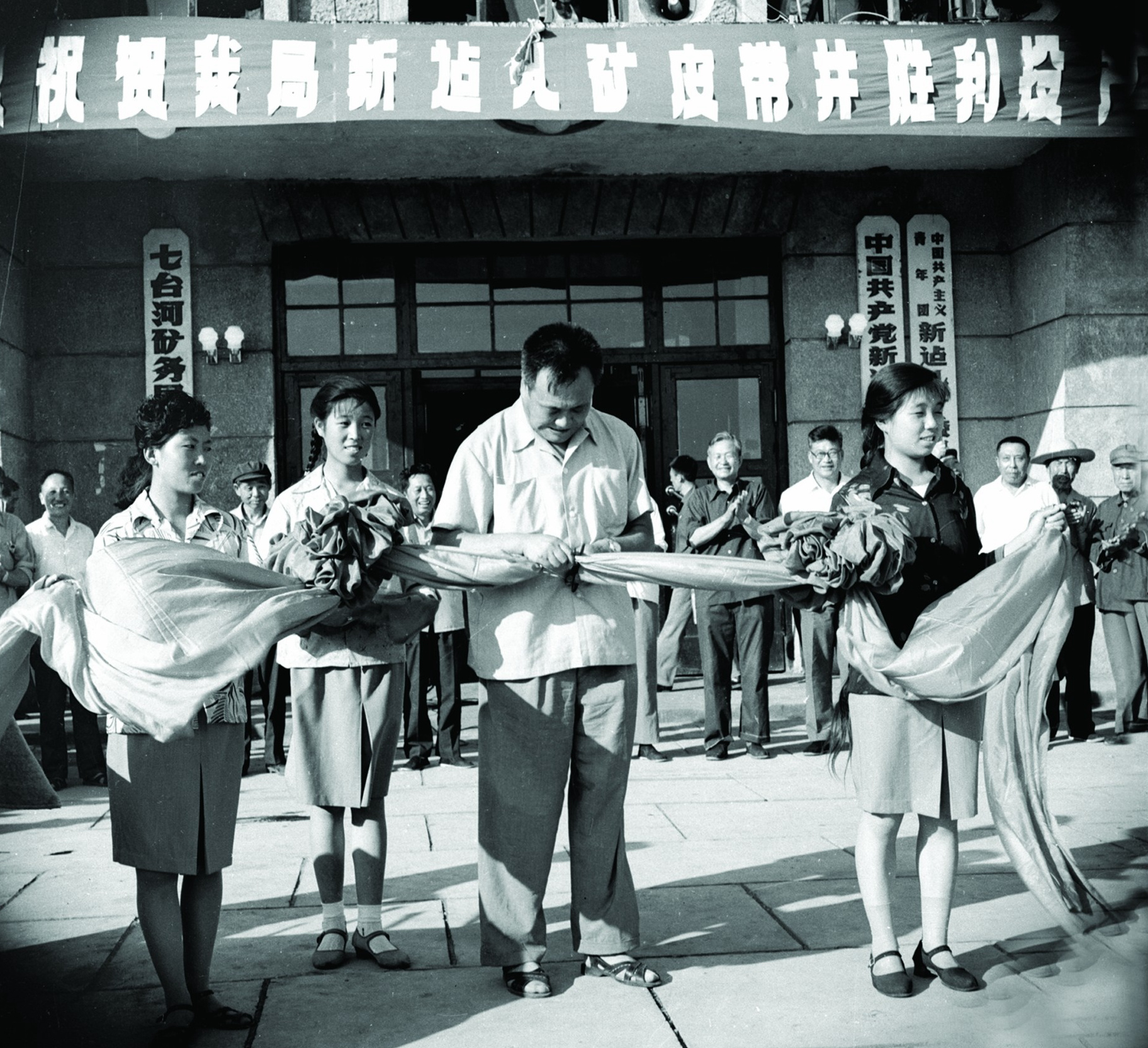 1982年8月1日,七臺河礦區新建煤礦皮帶井移交投產,圖為七臺河市委書記張占德為投產剪彩