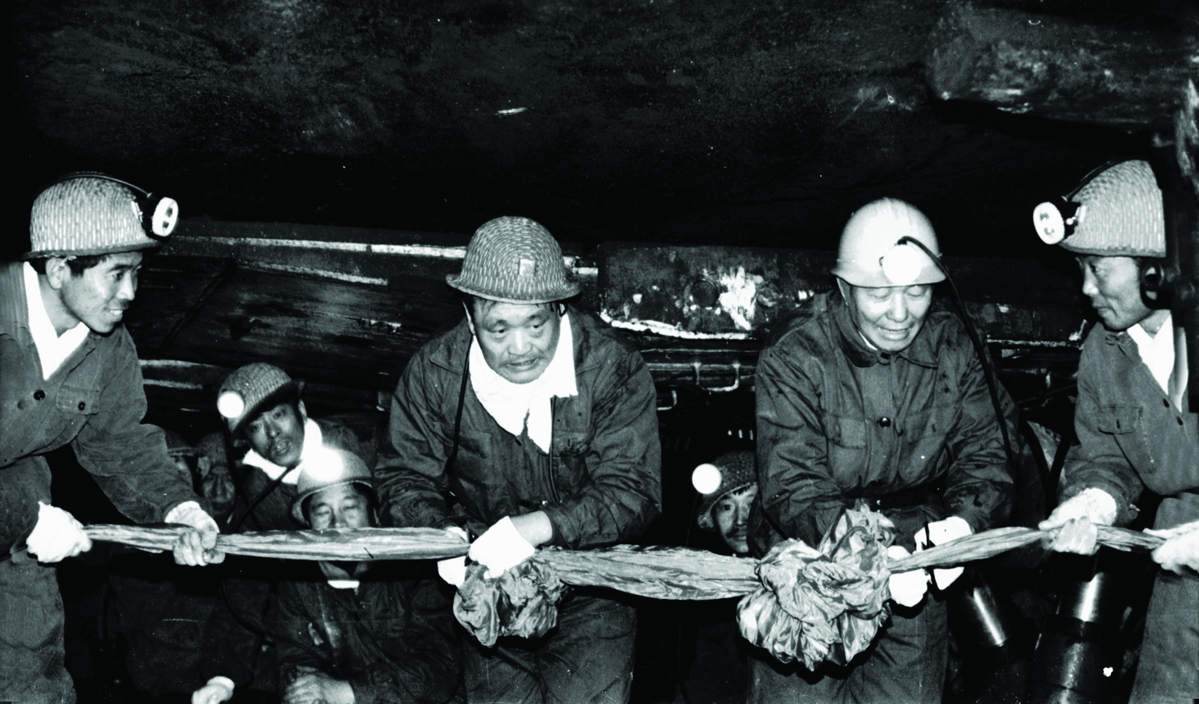 1985年4月16日,七臺河礦務局第一部綜采機組在新建煤礦投入生產。七臺河市委書記張占行(右三)、七臺河礦務局黨委書記于文吉(右二)為投產剪彩