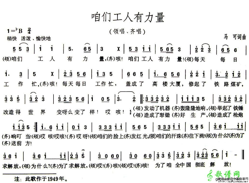 1947年初夏,為迎接新中國(guó)的成立,人民音樂(lè)家馬可先生從延安魯藝隨東北局派遣的慰問(wèn)團(tuán)來(lái)到東北,籌建東北魯迅文藝工作團(tuán)。1949年,馬可一起來(lái)到鶴崗原中央機(jī)械制造廠體驗(yàn)生活,參加工人假日義務(wù)勞動(dòng)。收到工人師傅火熱勞動(dòng)場(chǎng)面的感染,創(chuàng)作出這首富有時(shí)代強(qiáng)音的工人歌曲《咱們工人有力量》
