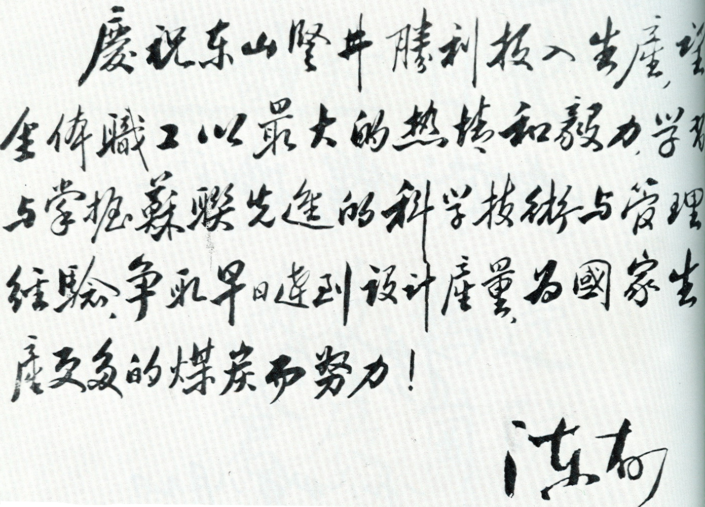 1955年,時(shí)任煤炭工業(yè)部部長(zhǎng)陳郁為鶴崗礦區(qū)東山豎井投產(chǎn)題詞。