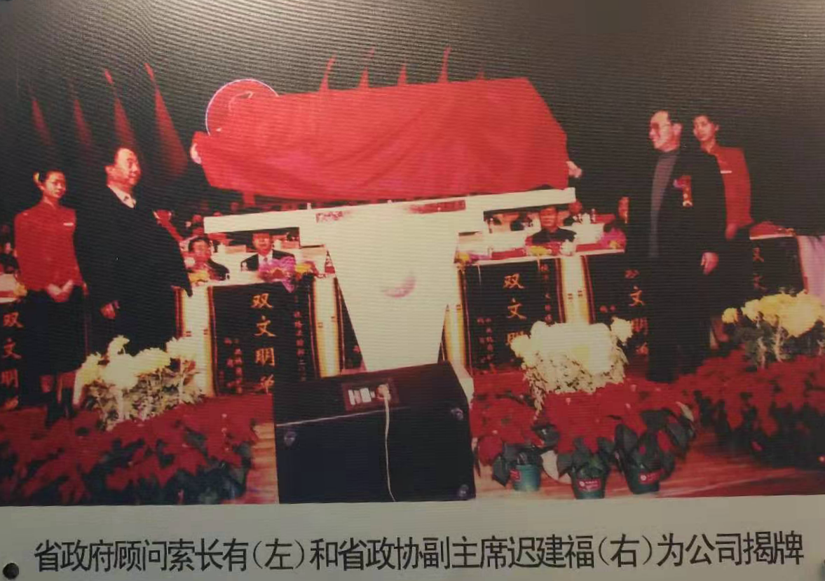 2002年12月18日,鶴崗礦業(yè)集團(tuán)有限責(zé)任公司,鶴崗煤礦集團(tuán)有限公司成立慶典暨雙文明建設(shè)表彰大會(huì)。圖為時(shí)任黑龍江省政府顧問(wèn)索長(zhǎng)有(左)和省政協(xié)副主席遲建福(右)為公司揭牌。