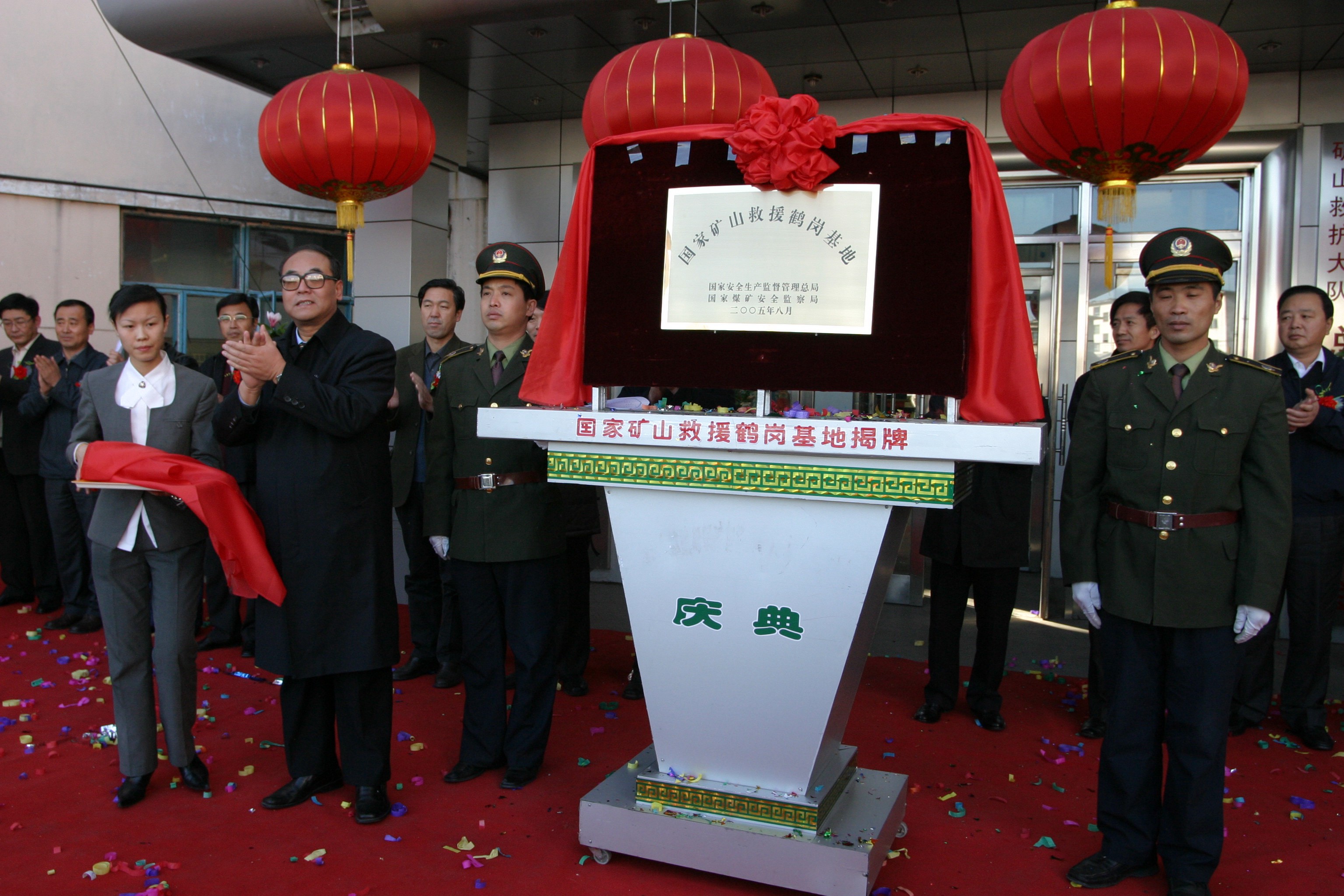 2005年11月10日,中央紀(jì)委駐國(guó)家安監(jiān)總局紀(jì)檢組組長(zhǎng)趙岸青(前左二)為國(guó)家礦山救援鶴崗基地揭牌。