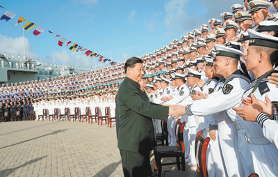 南海之濱的三亞,水天一色,日暖風清。軍港內,山東艦伏波靜臥、滿旗高懸,來自海軍部隊和航母建設單位的代表約5000人在碼頭整齊列隊,氣氛隆重熱烈。
