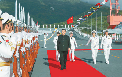 隨后,習近平登上山東艦,檢閱儀仗隊。習近平察看有關裝備,了解艦載機飛行員工作生活情況。習近平前往駕駛室,同官兵親切交流,在航泊日志上鄭重簽名。