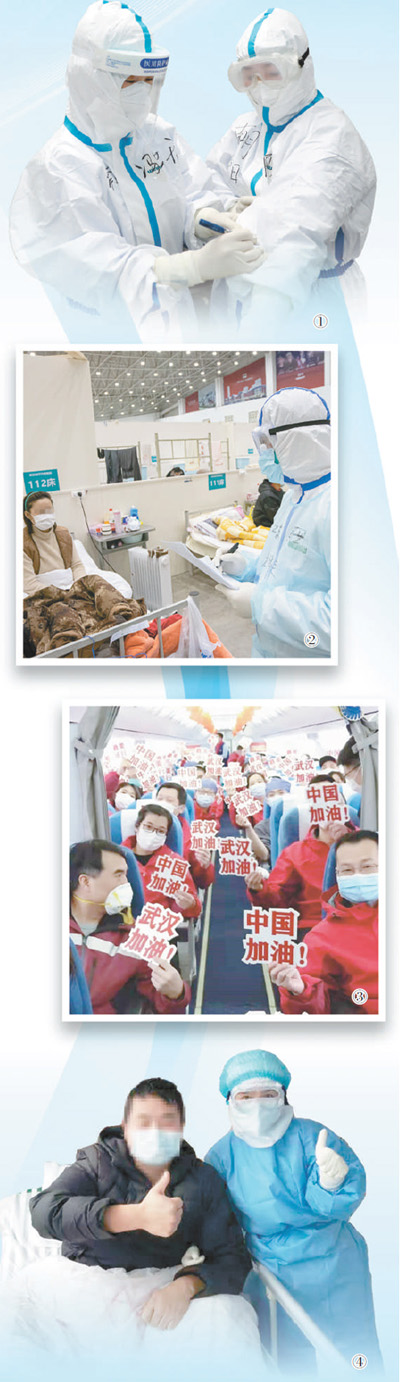 圖①:在武漢雷神山醫院病房,護士在防護服上臨時記錄患者飲食注意事項。