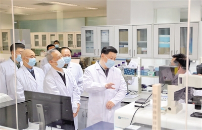 2日下午,習(xí)近平首先來到軍事醫(yī)學(xué)研究院,聽取研究院關(guān)于新冠肺炎疫情防控科研攻關(guān)的總體情況匯報,結(jié)合展板和實物了解疫苗和抗體研制、藥物篩選、病毒致病機(jī)理研究、快速檢測試劑研究和應(yīng)用等進(jìn)展情況。在儀器測試樓,習(xí)近平察看了重大疫情應(yīng)急防控藥物研究室,向堅守崗位、奮力攻關(guān)的一線專家和科研人員表示親切慰問。他強(qiáng)調(diào),提高治愈率、降低病亡率,最終戰(zhàn)勝疫情,關(guān)鍵要靠科技。習(xí)近平指出,新冠肺炎疫情發(fā)生以來,軍事醫(yī)學(xué)研究院堅決貫徹黨中央和中央軍委決策指示,聞令即動、爭分奪秒,集中力量展開應(yīng)急科研攻關(guān),取得了階段性成果,充分展現(xiàn)了人民軍隊忠于黨、忠于人民的政治本色和敢打硬仗、善打勝仗的優(yōu)良作風(fēng)。習(xí)近平希望他們再接再厲,充分發(fā)揮突擊隊和主力軍作用,盡快研制出安全有效的疫苗、藥物、檢測試劑,全力滿足抗擊疫情需要。要堅持在疫情可溯、可診、可防、可治、可控方面合力攻關(guān),通過打這場硬仗,掌握更多具有自主知識產(chǎn)權(quán)的核心科技,拿出更多硬核產(chǎn)品,為維護(hù)人民生命安全和身體健康、維護(hù)國家戰(zhàn)略安全作出更大貢獻(xiàn)。