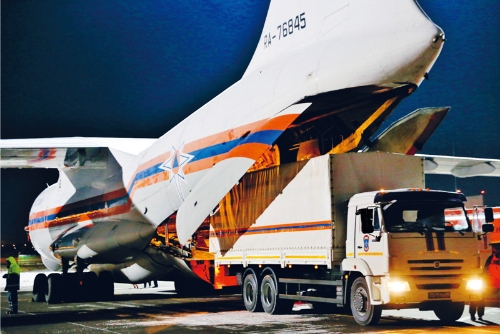 2020年2月8日,在俄羅斯莫斯科附近的茹科夫斯基機場,工作人員將俄羅斯政府向中方提供的醫療援助物資裝上運輸機。 新華社/衛星社