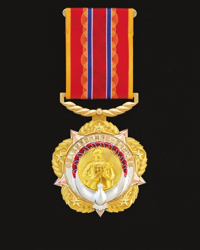 紀(jì)念章使用紫銅胎鍍金、銀材質(zhì),通徑為50毫米。紀(jì)念章核心部分為志愿軍戰(zhàn)士形象和70束光芒,以和平鴿、水紋和中朝兩國(guó)國(guó)旗元素編制的綬帶環(huán)繞四周,外圍采用五星、桂葉和象征五次戰(zhàn)役的箭頭等元素,組成金達(dá)萊花的五瓣造型,象征中國(guó)人民志愿軍抗美援朝出國(guó)作戰(zhàn)70周年,寓意偉大的抗美援朝戰(zhàn)爭(zhēng)是保衛(wèi)和平、反抗侵略的正義之戰(zhàn),偉大的抗美援朝精神永遠(yuǎn)是中國(guó)人民的寶貴財(cái)富,彰顯了我國(guó)不畏強(qiáng)敵、維護(hù)世界和平、構(gòu)建人類命運(yùn)共同體的堅(jiān)定決心和信心。