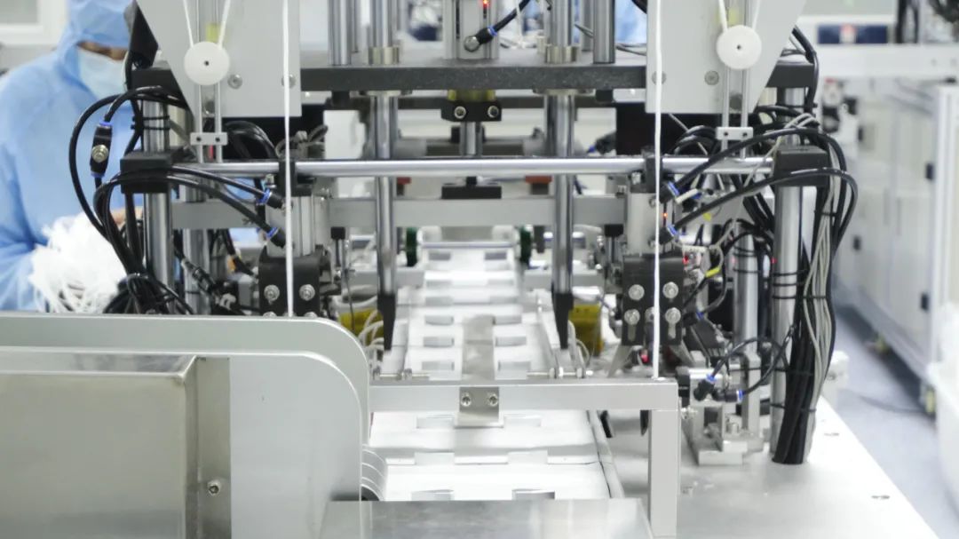 透過凈化車間內部觀光走廊,3臺口罩機正滿負荷工作,醫用口罩原材料從料臺由輸送帶自動輸送到口罩本體機再輸送到外耳帶焊接設備,最后成型,進入成品箱準備進行包裝,一氣呵成。