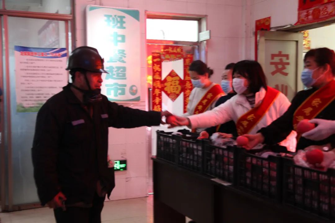 在活動現場,新安礦黨政領導和女工委負責人、家屬協管員們一起為入井的職工發放平安果,“新年快樂,注意安全”的聲聲祝福與一個個紅彤彤的蘋果,帶著溫暖送到職工的手中。