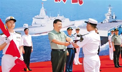 四月的三亞,天高海闊,日暖風清。軍港內,三型主戰艦艇一字排開,按海軍最高禮儀懸掛滿旗,來自海軍部隊和艦艇科研生產單位的代表2400人在碼頭整齊列隊,氣氛隆重熱烈。