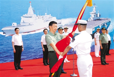 4月23日,海軍三型主戰艦艇——長征18號艇、大連艦、海南艦在海南三亞某軍港集中交接入列。中共中央總書記、國家主席、中央軍委主席習近平出席交接入列活動并登上艦艇視察。這是習近平向海南艦授予軍旗、命名證書。新華社記者 李 剛攝