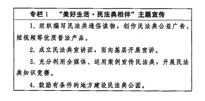 廣泛開展民法典普法工作,闡釋好民法典中國特色社會(huì)主義的特質(zhì),闡釋好民法典關(guān)于民事活動(dòng)平等、自愿、公平、誠信等基本原則,闡釋好民法典關(guān)于堅(jiān)持主體平等、保護(hù)財(cái)產(chǎn)權(quán)利、便利交易流轉(zhuǎn)、維護(hù)人格尊嚴(yán)、促進(jìn)家庭和諧、追究侵權(quán)責(zé)任等基本要求,闡釋好民法典一系列新規(guī)定新概念新精神。推動(dòng)各級(jí)黨和國家機(jī)關(guān)帶頭學(xué)習(xí)宣傳民法典,推動(dòng)領(lǐng)導(dǎo)干部做學(xué)習(xí)、遵守、維護(hù)民法典的表率,提高運(yùn)用民法典維護(hù)人民權(quán)益、化解矛盾糾紛、促進(jìn)社會(huì)和諧穩(wěn)定的能力和水平。把民法典納入國民教育體系,加強(qiáng)對(duì)青少年民法典教育。以“美好生活·民法典相伴”為主題,組織開展民法典主題宣傳,讓民法典走到群眾身邊、走進(jìn)群眾心里。