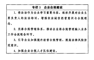 深化依法治企。深化“法律進(jìn)企業(yè)”,落實(shí)經(jīng)營管理人員學(xué)法用法制度。加強(qiáng)企業(yè)法治文化建設(shè),提高經(jīng)營管理人員依法經(jīng)營、依法管理能力。推動(dòng)企業(yè)合規(guī)建設(shè),防范法律風(fēng)險(xiǎn),提升企業(yè)管理法治化水平。