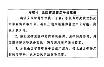 拓展普法網(wǎng)絡(luò)平臺(tái)。以互聯(lián)網(wǎng)思維和全媒體視角深耕智慧普法。強(qiáng)化全國智慧普法平臺(tái)功能,推動(dòng)與中國庭審公開網(wǎng)、中國裁判文書網(wǎng)等網(wǎng)絡(luò)平臺(tái)的信息共享。建立全國新媒體普法集群和矩陣,發(fā)揮“學(xué)習(xí)強(qiáng)國”等平臺(tái)優(yōu)勢(shì),形成多級(jí)互動(dòng)傳播。建設(shè)全國統(tǒng)一的法律、法規(guī)、規(guī)章、行政規(guī)范性文件、司法解釋和黨內(nèi)法規(guī)信息平臺(tái),及時(shí)更新數(shù)據(jù),免費(fèi)向公眾開放。