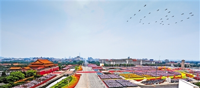 雄鷹翱翔,振翅長空。7時55分許,中國人民解放軍71架戰機飛向天安門廣場,向黨致敬,向祖國致敬,向人民致敬。空中護旗梯隊拉開飛行慶祝表演序幕,5架直升機分別懸掛中國共產黨黨旗和寫有“偉大的中國共產黨萬歲”“偉大的中國人民萬歲”“偉大的中華人民共和國萬歲”“全國各族人民大團結萬歲”的條幅迎風向前。隨后,直升機、戰斗機分別組成“100”“71”字樣掠過長空,15架殲—20飛機組成3個梯隊呼嘯而過,教練機拉出10道彩煙,精彩的表演激起一陣陣歡呼聲。