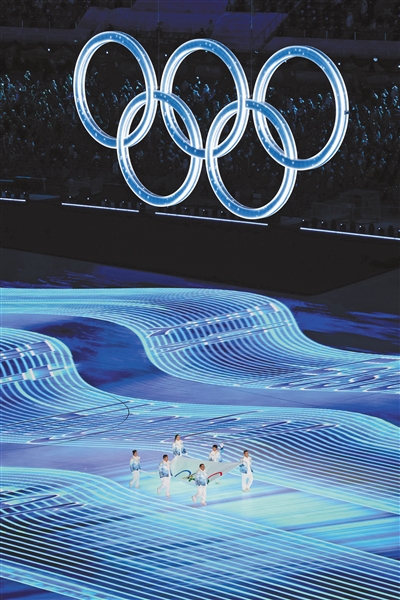 此時,6名冰球運動員出現在場地中,他們擊打著“影像冰球”,不斷撞向這塊巨大的“冰立方”。冰屑滾滾散落,晶瑩的冰雪五環破冰而出。這是屬于奧林匹克的時刻,這是以奧運精神將世界團結在一起的時刻。