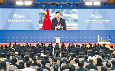 4月21日上午,博鰲亞洲論壇2022年年會開幕式在海南博鰲舉行,國家主席習近平以視頻方式發表題為《攜手迎接挑戰,合作開創未來》的主旨演講。新華社記者 黃敬文攝