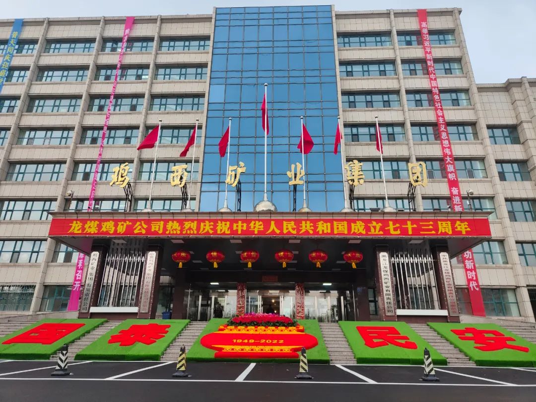 在雞礦公司機關院內,16面鮮艷的國旗對稱懸掛,莊嚴中彌漫著喜悅;綠底紅字擺出的“國泰民安”字樣,贊美里飽含著祝福;主建筑上的五色條幅書寫著“高舉習近平新時代中國特色社會主義思想偉大旗幟 奮進新征程 建功新時代”等寶貴信念,彰顯著雞礦態度、雞礦信心、雞礦決心、雞礦熱情!