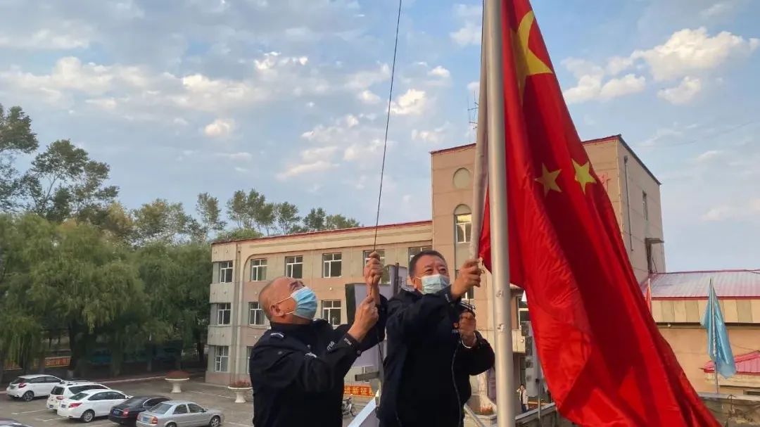 圖為:武保科干警吳德才、王曉峰莊嚴地升起五星紅旗