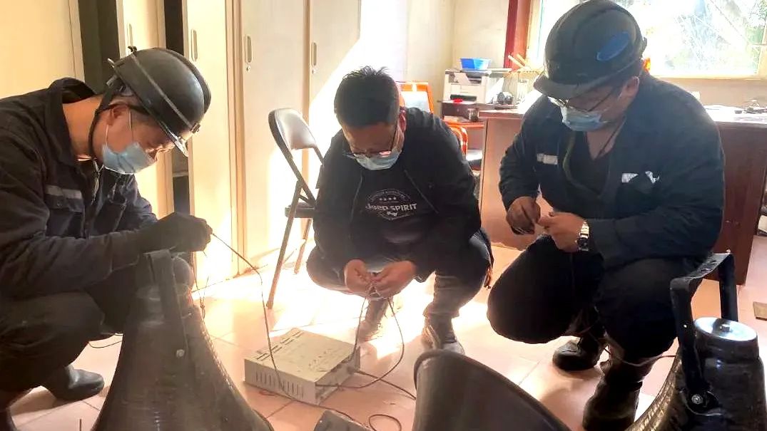 圖為:監測隊機電副隊長谷鵬帶領維修小分隊搶修通訊設備