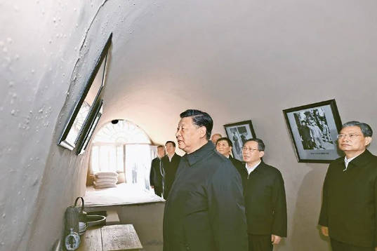 2022年10月27日,中共中央總書記、國家主席、中央軍委主席習近平帶領中共中央政治局常委李強、趙樂際、王滬寧、蔡奇、丁薛祥、李希,瞻仰延安革命紀念地。這是習近平等在楊家嶺參觀朱德舊居。 新華社記者 燕雁/攝