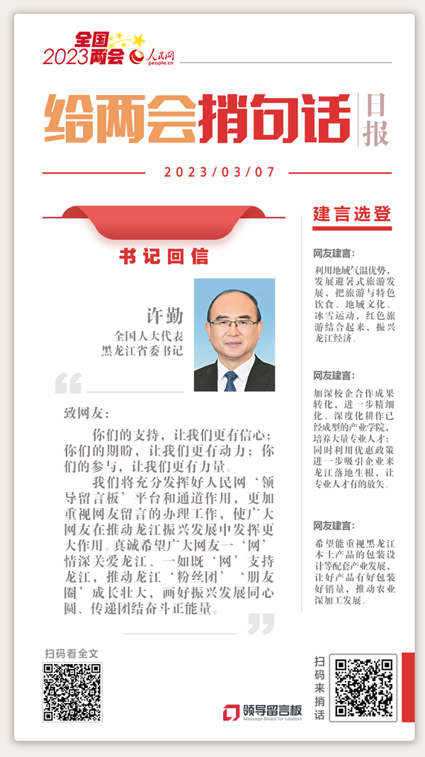 人民網2023年度“我給兩會捎句話”建言征集活動正在進行,廣大網友關注并積極參與。近日,黑龍江省委書記許勤通過人民網致信網友,回應群眾關切。