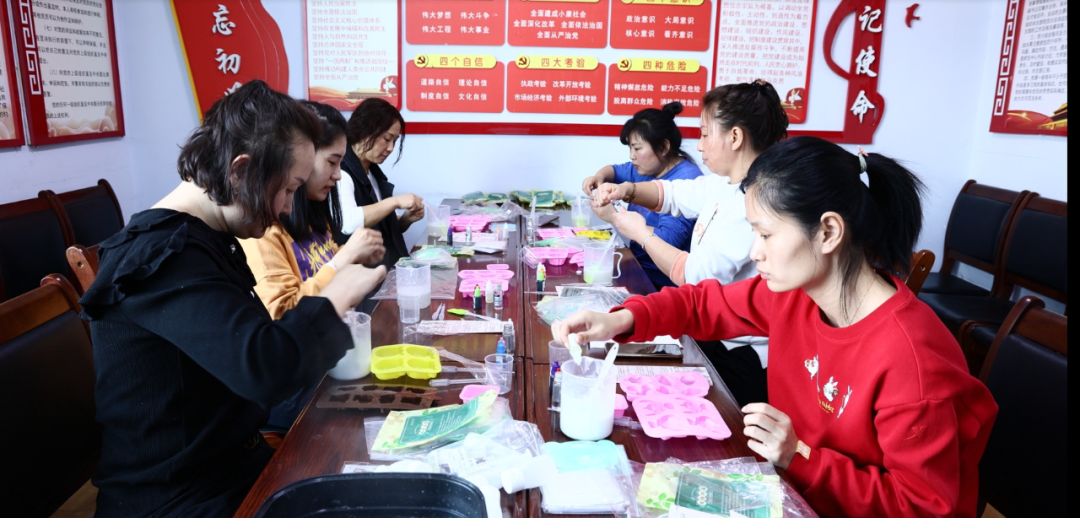 在建設礦活動室,幾位女職工觀看完制作手工皂的說明書和視頻教程后,將皂基倒入量杯內,再把量杯放在提前準備好的蒸鍋中進行熬制。加入牛奶、植物精油、食用香精和色素等,經過調制、攪拌等過程,最后把皂液倒入各式各樣的模具中。十幾分鐘后,形狀各異、五顏六色的手工皂制作完成。制作過程中,她們互相幫忙,聊著家常,爽朗的笑容散發著女性特有的團結友愛、敬老愛親、勤儉持家的品質和魅力。