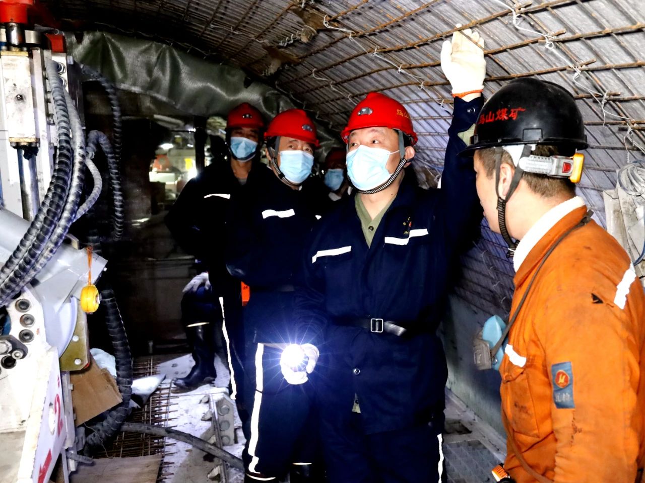 在鳥山礦井下 “龍鶴二號”盾構機作業現場,王佳喜聽取了的當班安瓦員的崗位描述,查看了工作面現場圍巖狀況,詳細了解了盾構機工作原理、進尺速度、人員配備及操作流程,以及工作面地質勘探和盾構機在生產期間遇到的問題、維護保養等情況。