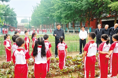 隨后,習近平來到學生農場。這里是學生開展農業種植活動的實踐場所,陽光下、田壟上,一排排綠油油的菜苗生機勃勃。孩子們拿著水桶、鏟子、耙子、毛筆,為西紅柿、黃瓜等澆水、松土、除草、授粉。習近平強調,很多知識和道理都來自勞動、來自生活。引導孩子們從小樹立勞動觀念,培養勞動習慣,提高勞動能力,有利于他們更好地學習知識。現在一些城里的孩子接觸農村、接觸大自然少,不光“四體不勤”,而且“五谷不分”,對吃的是什么、從哪里來的、怎么來的都不知道,更體會不到“誰知盤中餐,粒粒皆辛苦”。他對同學們說,認識大自然,首先要從認識身邊的植物開始。同學們栽培的各種植物,雖然書本上都有介紹,但大家親手種、親自培育、跟蹤觀察,收獲肯定是不一樣的。希望同學們從“學農”中感受到農作的艱辛和農民的不易,從小養成熱愛勞動、珍愛糧食、尊重自然的良好習慣,為建設美麗中國作貢獻。新時代生態文明建設要從娃娃抓起,通過生動活潑的勞動體驗課程,讓孩子親自動手、親身體驗、自我感悟,讓“綠水青山就是金山銀山”的理念早早植入孩子的心靈。