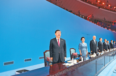 19時58分,在《和平——命運共同體》的樂曲聲中,習近平和夫人彭麗媛,同國際大學生體育聯合會代理主席艾德等步入主席臺,向觀眾揮手致意。全場響起長時間的熱烈掌聲。