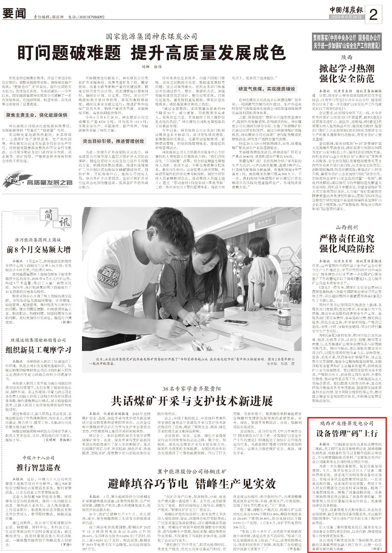 2023年9月28日,《中國(guó)煤炭報(bào)》對(duì)雞西礦業(yè)公司引入設(shè)備二維碼管理系統(tǒng)進(jìn)行報(bào)道。