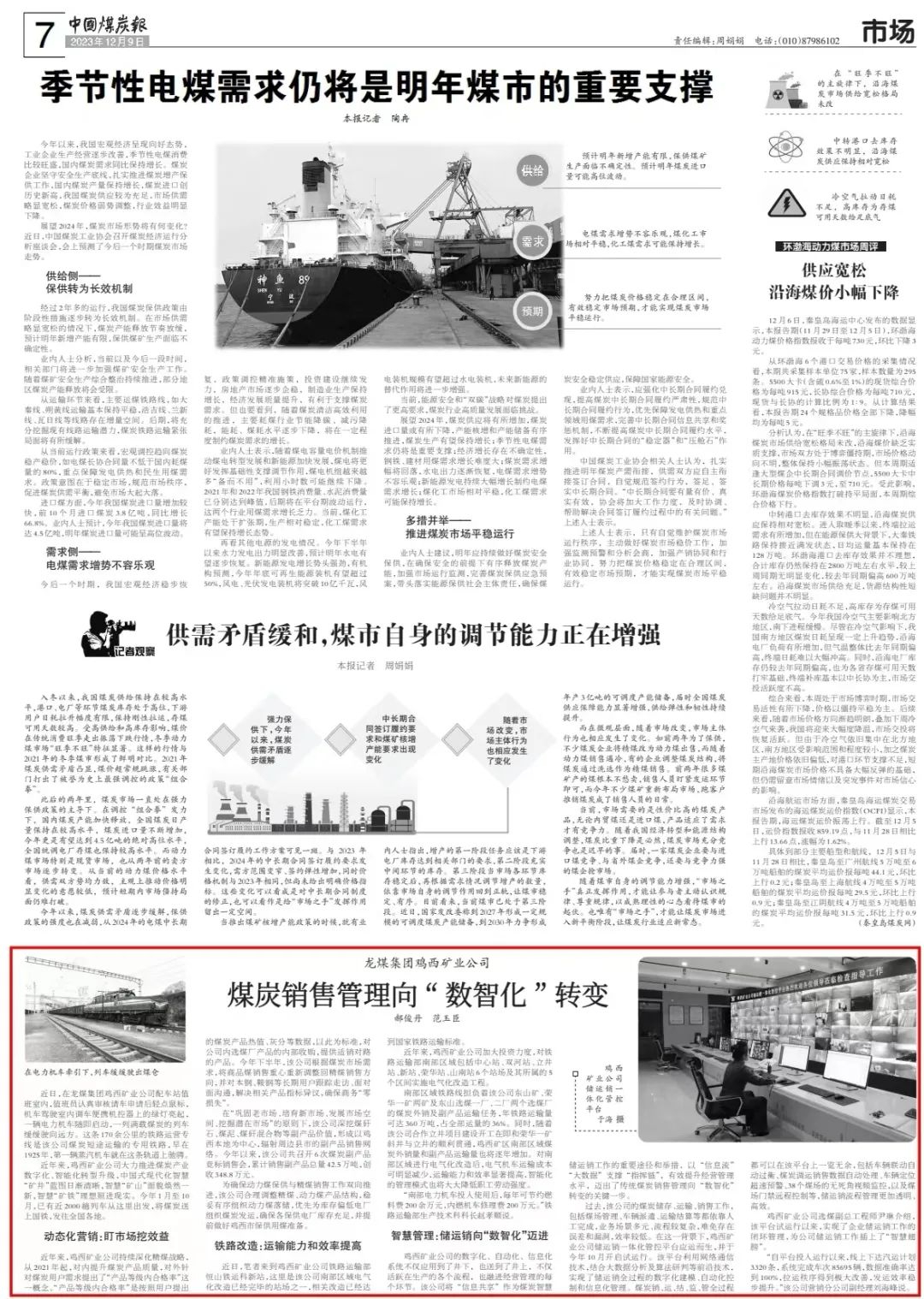 雞西礦業公司的數字化、自動化、信息化系統不僅應用到了井下,也送到了井上,不僅活躍在生產的各個流程,也融進經營管理的每個環節。該公司將“信息共享”作為煤炭智慧儲運銷工作的重要途徑和舉措,以“信息流”“大數據”支撐“指揮鏈”,有效提升經營管理水平,邁出了傳統煤炭銷售管理向“數智化”轉變的關鍵一步。