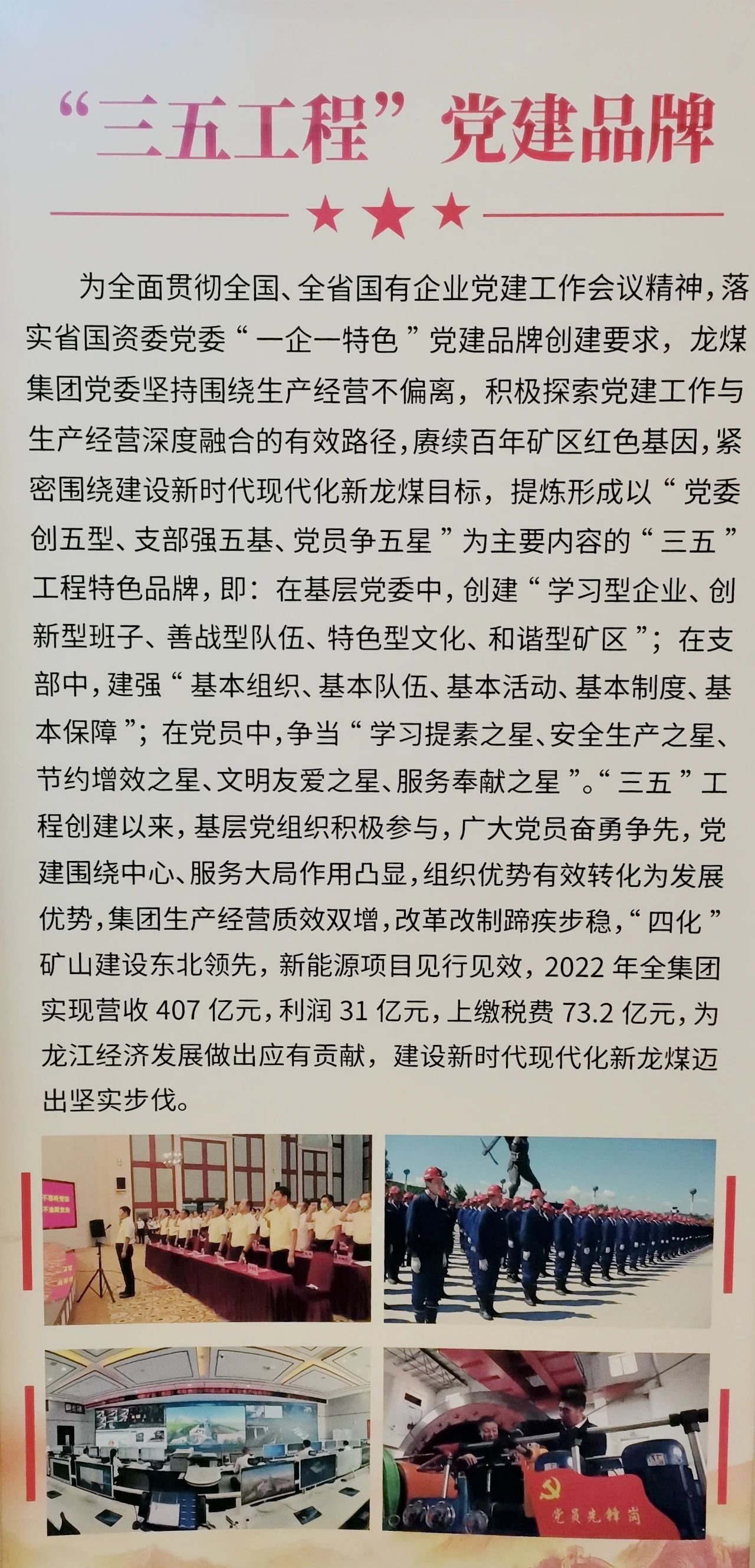 近年來,為全面貫徹全國、全省國有企業(yè)黨建工作會議精神,集團公司黨委堅持圍繞生產(chǎn)經(jīng)營不偏離,積極探索黨建工作與生產(chǎn)經(jīng)營深度融合的有效路徑,賡續(xù)百年礦區(qū)紅色基因,緊密圍繞建設(shè)新時代現(xiàn)代化新龍煤目標(biāo),提煉形成以“黨委創(chuàng)五型、支部強五基、黨員爭五星”為主要內(nèi)容的“三五”工程特色品牌,即:在基層黨委中,創(chuàng)建“學(xué)習(xí)型企業(yè)、創(chuàng)新型班子、善戰(zhàn)型隊伍、特色型文化、和諧型礦區(qū)”;在支部中,建強“基本組織、基本隊伍、基本活動、基本制度、基本保障”;在黨員中,爭當(dāng)“學(xué)習(xí)提素之星、安全生產(chǎn)之星、節(jié)約增效之星、文明友愛之星、服務(wù)奉獻之星”。“三五”工程創(chuàng)建以來,基層黨組織積極參與,廣大黨員奮勇爭先,黨建圍繞中心、服務(wù)大局作用凸顯,組織優(yōu)勢有效轉(zhuǎn)化為發(fā)展優(yōu)勢,集團生產(chǎn)經(jīng)營質(zhì)效雙增,改革改制蹄疾步穩(wěn),“四化”礦山建設(shè)東北領(lǐng)先,新能源項目見行見效,2022年全集團實現(xiàn)營收407億元,利潤31億元,上繳稅費73.2億元。