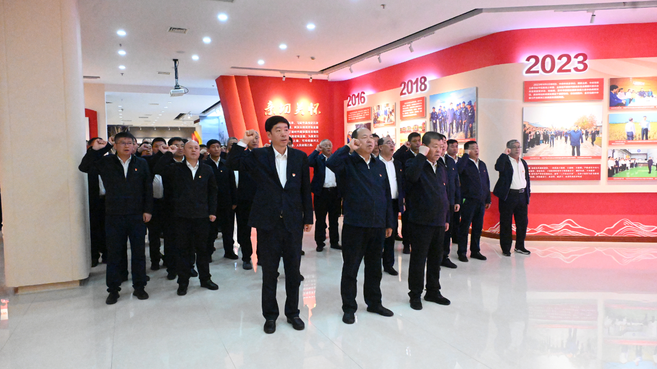 參加活動的黨員干部在黨旗前整齊列隊,舉起右拳,重溫了入黨誓詞。