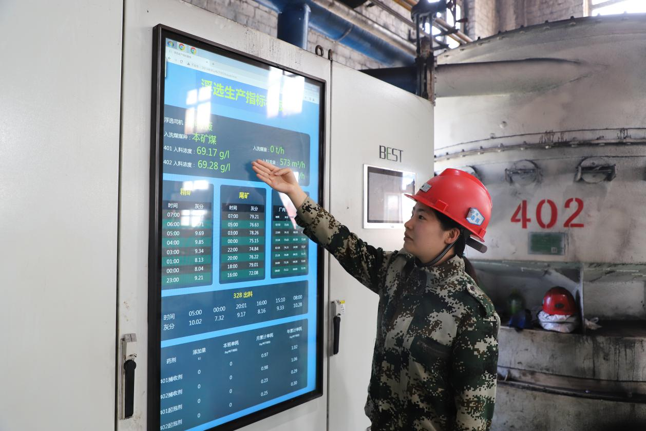 城山礦智能選煤廠現場人員在可操控的顯示屏上查看調整數據