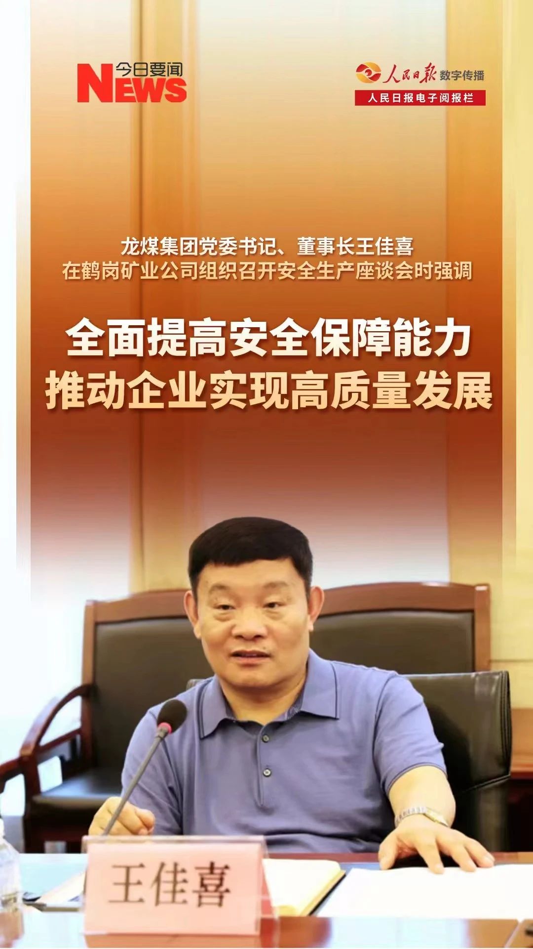 8月17日下午,集團公司黨委書記、董事長王佳喜在鶴崗礦業公司組織召開安全生產座談會。他強調,要堅持深入學習貫徹黨的二十屆三中全會精神和習近平總書記重要講話精神,認真落實省委十三屆六次全會部署要求,以提高企業經濟運行效益為核心,全面加強各項基礎工作,為企業實現高質量發展,助推中國式現代化建設作出積極貢獻。