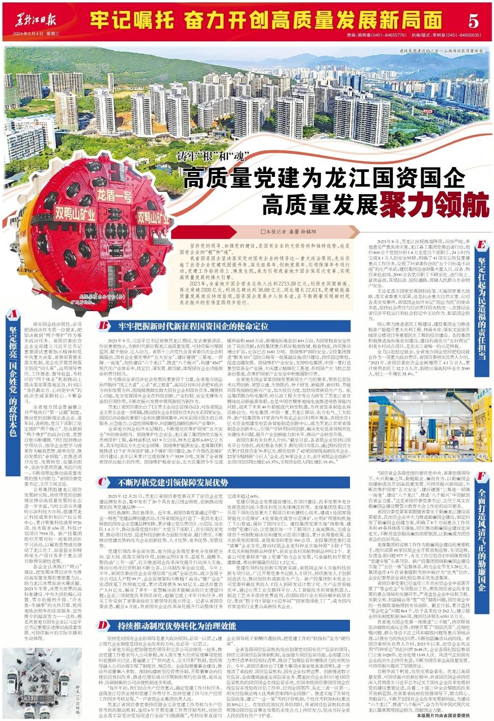 2023年9月,習近平總書記視察黑龍江期間,發(fā)表重要講話、作出重要指示,為新時代新征程龍江全面振興擘畫藍圖、賦予使命、注入動力。省第十三次黨代會及省委歷次全會明確提出,國有企業(yè)要在維護“五大安全”,建好建強“三基地、一屏障、一高地”,加快建設“六個龍江”、推進“八個振興”,構建“4567”現(xiàn)代化產(chǎn)業(yè)體系中,找定位、謀發(fā)展、做貢獻,體現(xiàn)國有企業(yè)功能使命和責任擔當。