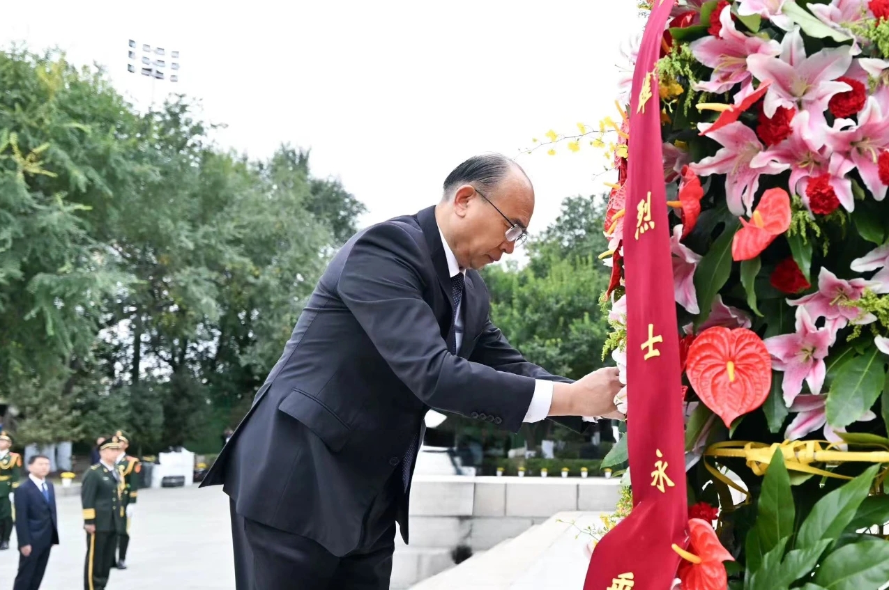 許勤、梁惠玲等省領導及各界代表緩步繞行,瞻仰烈士紀念塔。