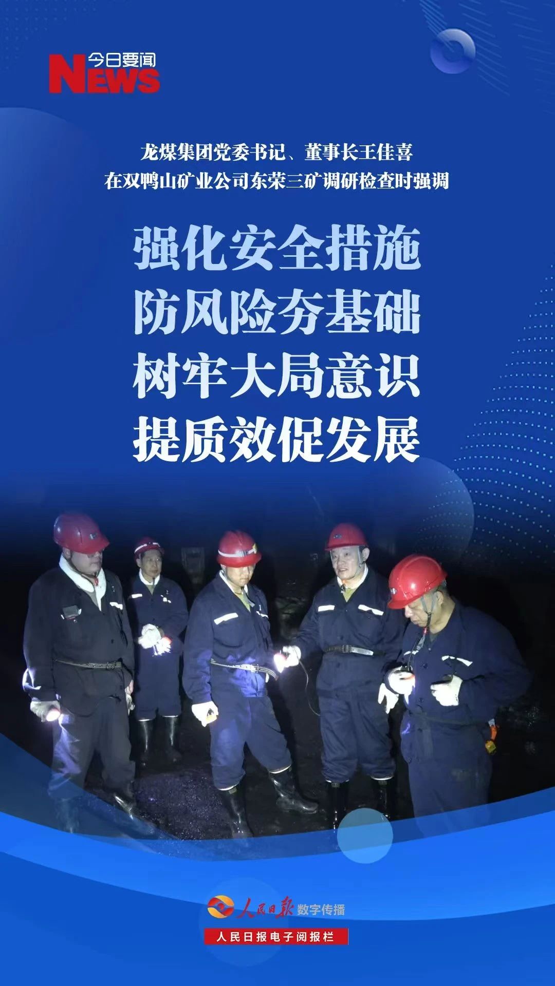 4月23日,龍煤集團黨委書記、董事長王佳喜在雙鴨山礦業公司東榮三礦調研檢查安全生產工作時強調,要積極主動應對當前煤炭市場形勢,進一步強化大局意識、安全意識、質量意識,突出科技支撐,提高管理質效,推動企業高質量發展。